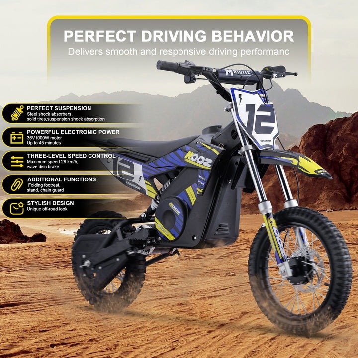 Introducing the MotoTec 36V 1000W electric dirt bike! Powered by a 1000 watt DC brushed electric motor, rugged chain drive, front and rear suspension and half twist throttle for safety. Great for driveway and backyard fun, cruise over bumps and speed through dirt trails with ease.